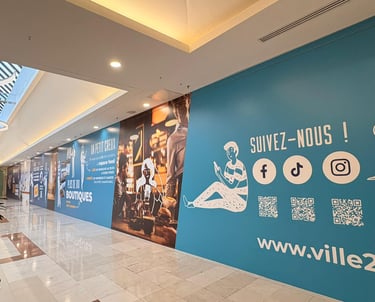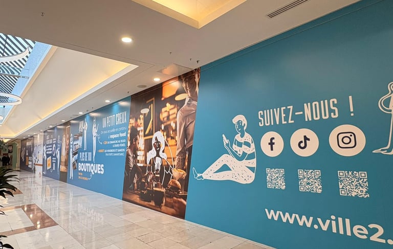 J’ai récemment conçu la palissade installée au sein du centre commercial Ville2. Pensé comme un parcours graphique, ce projet avait pour objectif d’apporter clarté et rythme à l’espace tout en accompagnant l’expérience des visiteurs durant la période de travaux.
